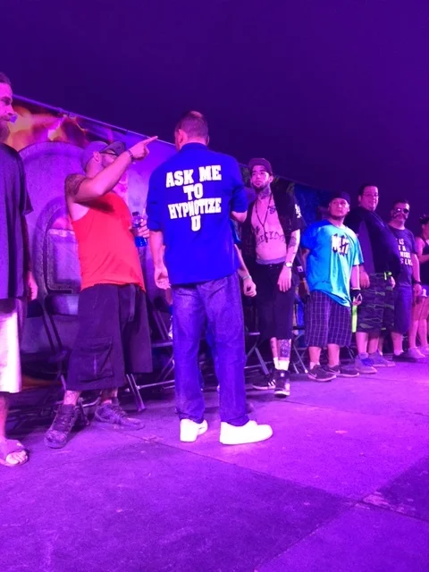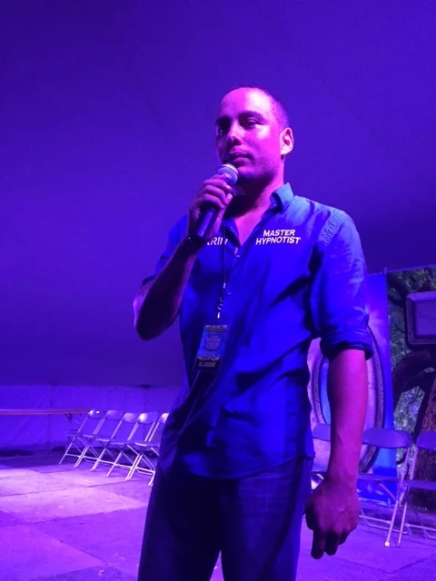 Instead, he leaned into being a representative of Oklahoma City’s shittiness and did so well that the crowd was begging for more. Cameron was followed by yet another of the comedy tent’s vaguely comedy-related novelty attractions. In this case, that was Darrin Johnson, a handsome, light-skinned black man with a shirt with his name and “Master Hypnotist” on the front and “Let Me Hypnotize U” on the back who was, I quickly ascertained, a master hypnotist who wants to hypnotize you.