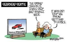 The crazy thing about Gearhead Gertie is that its creator, Mike Smith, is not wholly devoid of talent. He’s not a bad editorial cartoonist with a leftist bent but when it comes to Gearhead Gertie, he is intent on driving one semi-joke into the ground over and over again.