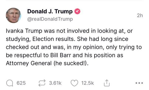 That is the very specific context of a message that Trump sent out on his own Truth Social site, “Ivanka Trump was not involved in looking at, or studying, Election results. She had long since checked out and was, in my opinion, only trying to be respectful to Bill Barr and his position as Attorney General (he sucked!)”