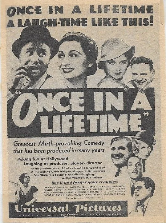 The 1932 feature film adaptation of Moss Hart and George S. Kaufman’s hit play Once in a Lifetime opens on a hilariously self-aggrandizing note, literally and figuratively. The scathing Hollywood satire begins with a letter from producer/executive Carl Laemmle Jr. insisting that when he bought the film rights to Hart and Kaufman’s play critics insisted that it would be a mistake to use its best material on account of it being “too funny” and it would “make the world laugh at us.” The son of Universal’s founder closes by insisting that entertaining the suffering masses was worth the potential damage to the movie world’s reputation.