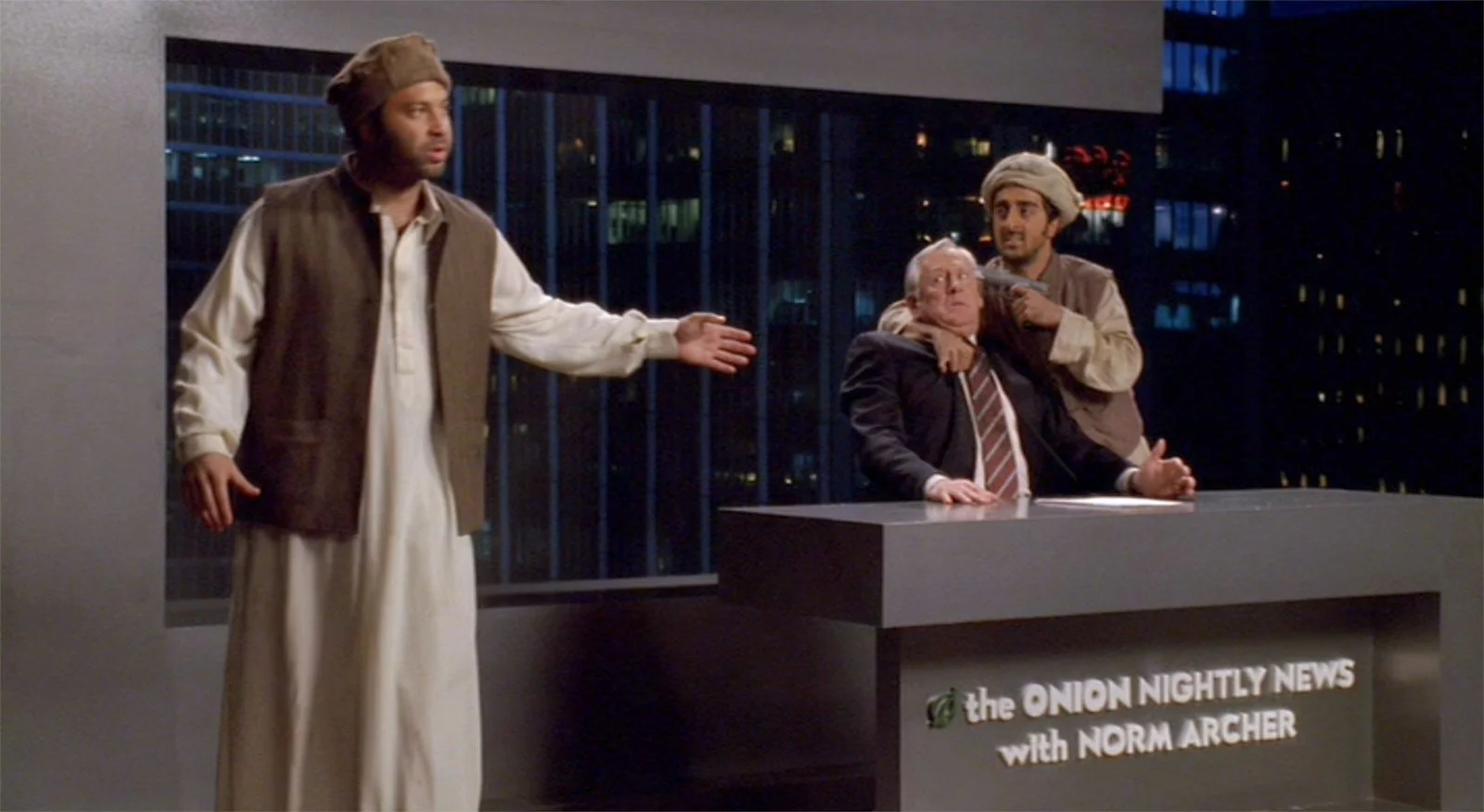 The Onion Movie won a whole bunch of nostalgia points by faithfully referencing articles I’ve damn near memorized and tattooed on my body. And I willingly concede that some of the sketches are genuinely funny, like an early segment involving an angry black man (identified only as “Armed Gunman”) who storms into a bank and demands a good, challenging job at gunpoint. The gag escalates as we follow him through his various personal triumphs in the banking industry but the sketch is less funny in light of the many sketches to follow that depict non-white people and non-heterosexuals as criminals, sex freaks, terrorists and thugs.