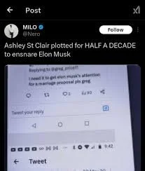 “Ashley St. Clair plotted for HALF A DECADE to ensnare Elon Musk,” read the tweet, which was accompanied by a screenshot of a 2020 post about wanting “Musk’s attention for a marriage proposal.”